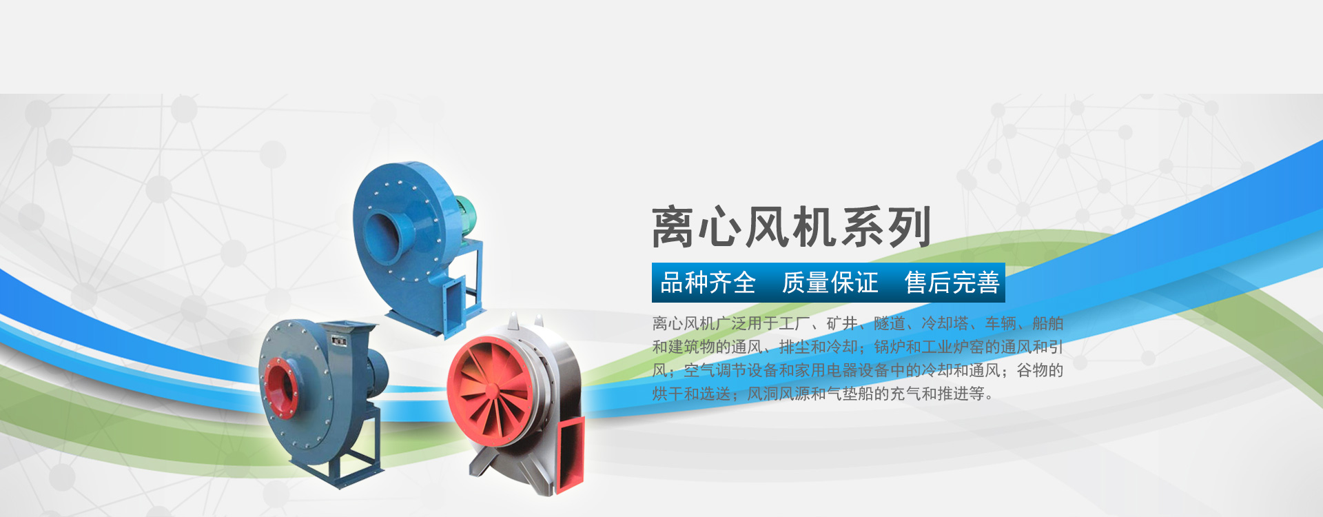 本公司專業生產中低壓離心風機、高壓離心風機、高溫離心風機、多級離心風機、熔噴布羅茨風機、羅茨風機等,產品種類達幾百種,